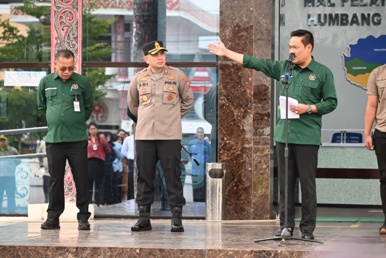 Humbahas | Lintas Rakyat – Bupati Humbang Hasundutan, Dr. Oloan P. Nababan, SH, MH memimpin apel kegiatan Operasi Gabungan Sadar Pajak Kendaraan Bermotor dan Bea Balik Nama Kendaraan Bermotor (BBNKB) yang dilaksanakan di Pelataran Mal Pelayanan Publik (MPP) Doloksanggul, Selasa (21/4/2026).