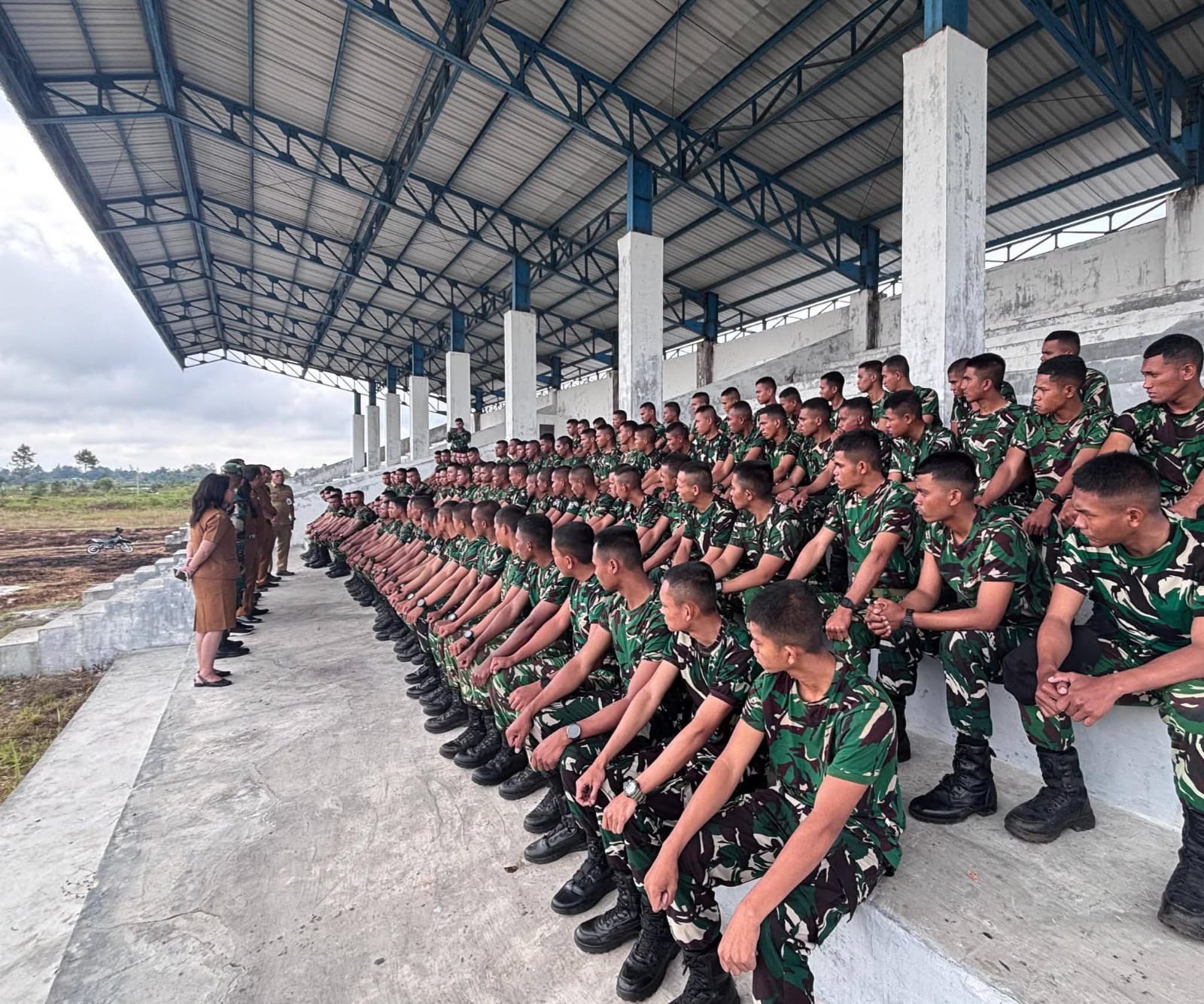 Humbahas | Lintas Rakyat | Bupati Humbang Hasundutan Dr. Oloan Paniaran Nababan, SH., MH yang diwakili Asisten Administrasi Umum Jaulim Simanullang menyambut kedatangan prajurit Batalyon Infanteri Teritorial Pembangunan (Yonif TP) 955/Hoda Sihapaspili di markas sementara yang berada di Stadion Simangaronsang, Kecamatan Doloksanggul, Senin (09/03/2026).