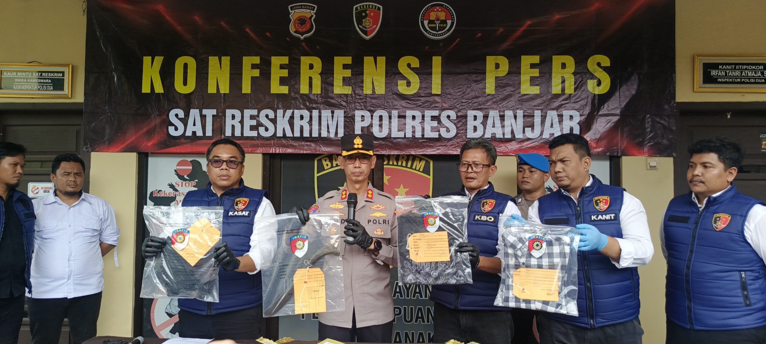Barang bukti yang diamankan antara lain golok yang digunakan pelaku, baju korban bercak darah, serta sepeda motor milik pelaku. Kasat Reskrim Polres Banjar, Heru Samsul Bahri, S.E., M.M., C.PHR., CBA, menegaskan, “Pelaku merupakan residivis yang baru keluar dari penjara pada September 2025. Penindakan tegas ini menjadi peringatan bagi pelaku kriminal lainnya.” menurut keterangan Kasat Reskrim dalam Konferensi pers.