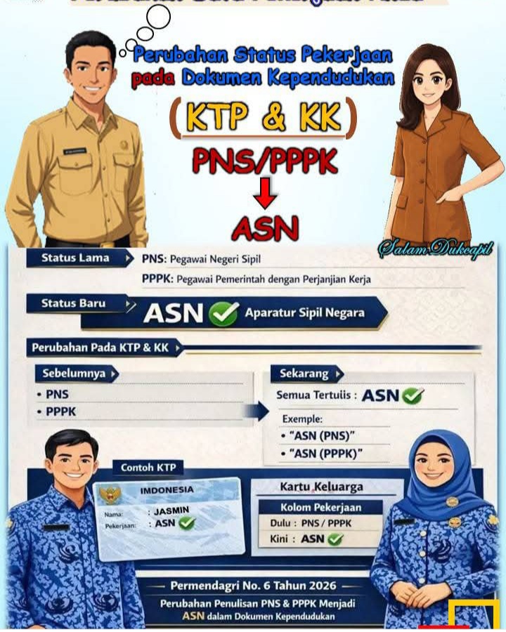 Pemerintah dengan Perjanjian Kerja (PPPK) yang merupakan Aparatur Sipil Negara (ASN) untuk segera melakukan perubahan status pekerjaan pada dokumen kependudukan yaitu Kartu Tanda Penduduk (KTP) dan Kartu Keluarga (KK).